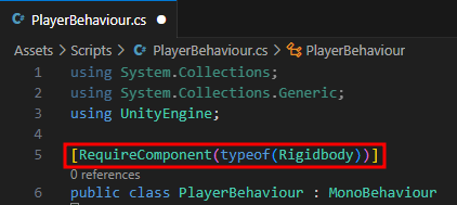 Rigidbody를 필수로 가져야 한다는 것을 의미하고 만일 없으면 Rigidbody가 자동으로 추가된다.