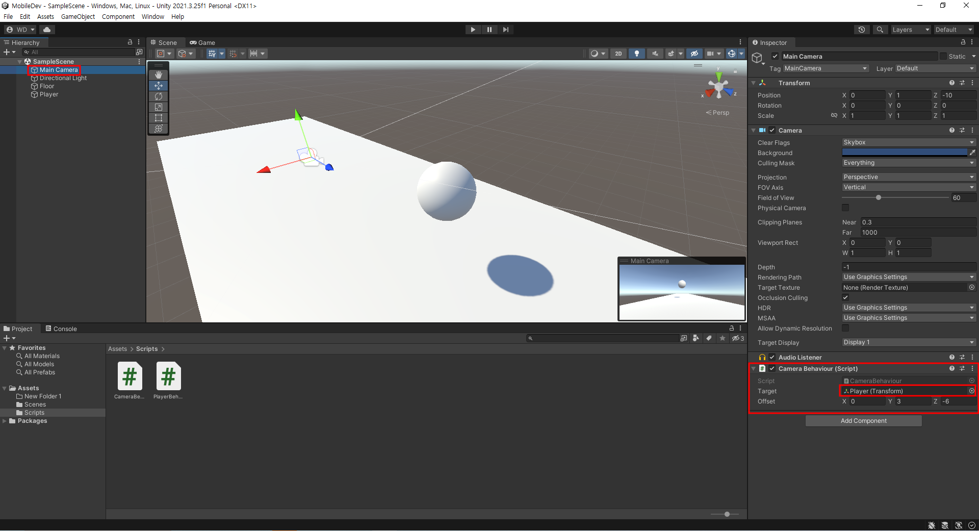 코드를 작성해주고 Main Camera를 눌러서 인스펙터 창에 카메라 스크립트를 추가해주고 Target에다가 Player(오브젝트)를 드래그해서 집어 넣어 준다. 그리고 실행해서 확인 한다.