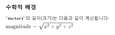 Vector3.magnitude는 벡터의 길이(크기)를 나타내는 속성입니다. 벡터의 길이는 원점(0,0,0)에서 해당 벡터가 가리키는 점까지의 거리로 정의됩니다. 이는 벡터의 각 성분(x, y, z)의 제곱 합의 제곱근으로 계산됩니다.