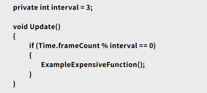 Update() 함수는 매 프레임마다 호출됩니다. 모든 코드를 반드시 모든 프레임에 실행해야 하는지 검토해보세요. 의외로 그렇지 않는 코드들도 많이 발견하게 될섭니다. Update, LateUpdate, FixedUpdate에서 제외하세요. 반드시 Update를 사용해야 한다면 n개 프레임마다 코드를 실행하는 방안도 검토 가능할 것입니다.