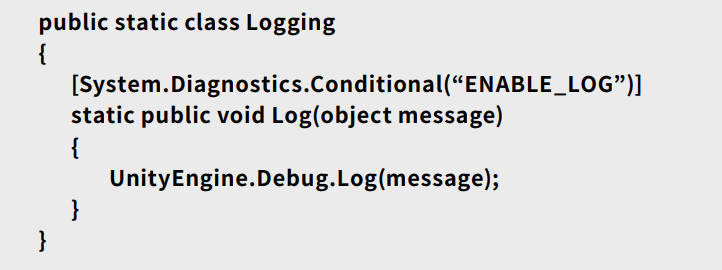 Log 구문, 특히 Update, LateUpdate 또는 FixedUpdate에 있는 Log 구문은 성능을 낮출 수 있습니다. 빌드를 만들기 전에 Log 구문을 비활성화하세요. 이 작업을 보다 쉽게 하려면 프리 프로세서 지시문과 함께 조건부 속성을 만드는 것이 좋습니다.