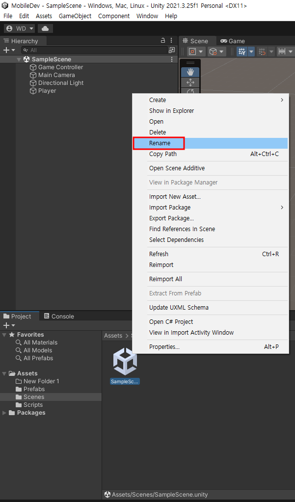 현재 씬에서 게임플레이가 실행되므로 Rename으로 씬의 이름을 바꿔주자