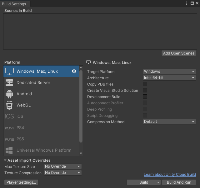 그러면 다음과 같이 창이 뜰텐데 여기서 Add Open Scenes을 클릭해주자
