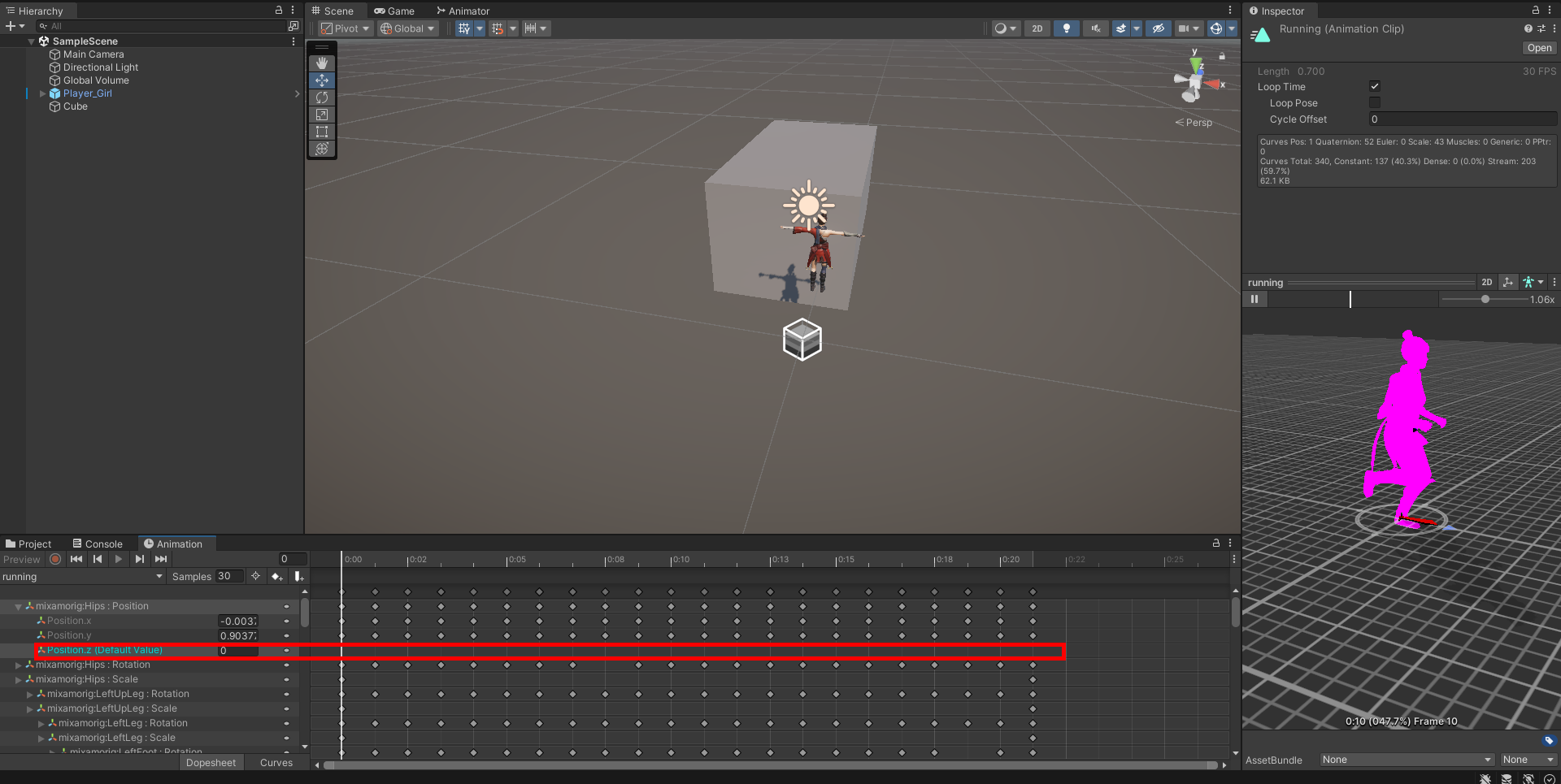 만약에 유니티에서 고치고 싶으면 원하는 애니메이션을 누르고 애니메이션 탭에 들어간뒤 Position에서 z축을 없애면 제자리에서 움직임.