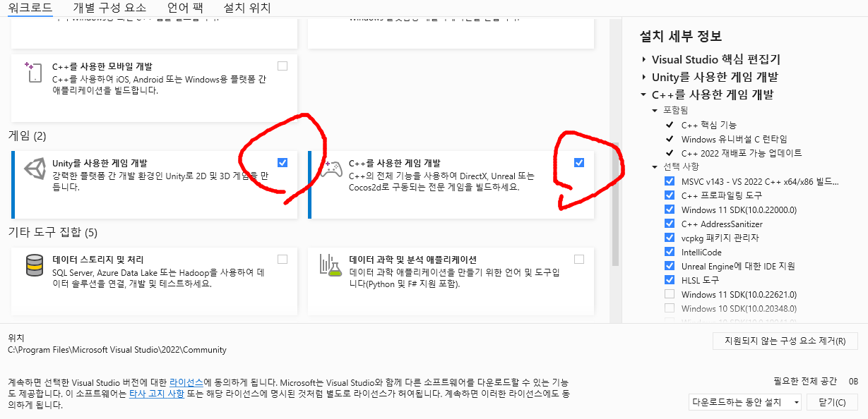 2. 워크로드에서 중간으로 내리다보면 게임탭을 선택후 설치한다. ( Unity를 사용한 게임 개발 하나만 체크해도 상관 없음 )