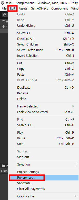 설치가 다 된 후에 유니티를 열어서 왼쪽 상단에 Edit -> Preferences 를 클릭한다.