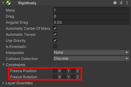 Freeze Position, Freeze Rotation : X Y Z값에 체크를 하면 체크된곳이 위치나 회전변경 불가능.