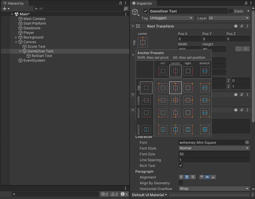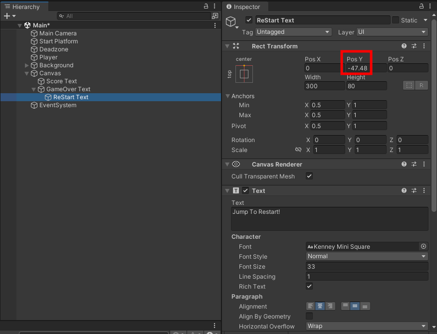 게임오버 텍스트 복사후 Restart로 만들고 Pos Y 조정해서 아래쪽에 배치